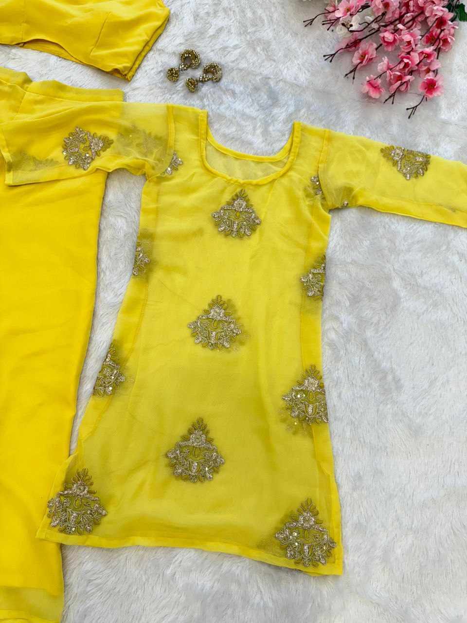 Top – Pure Georgette top featuring elegant embroidery cording and sequence work, fully stitched in a loose-fit silhouette (free size 38–44)